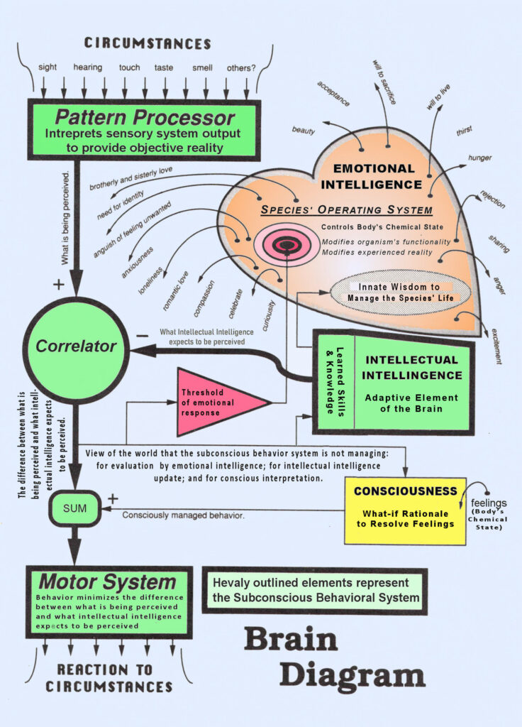 Regarding further considerations on how the elements of the brain diagram interact, I leave that to the reader, if so inspired. As an example, individuals who have practiced a performance, to near perfection, are often unable to perform it as well, on stage. This occurs because emotional intelligence is so concerned about doing well, that it “emotes” feelings/chemicals of anxiety which we typically refer to as stage fright. This inspires the conscious mind to contribute, by trying to improve on the rehearsed performance, an effort that is usually counterproductive.